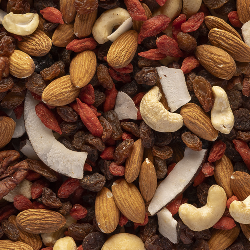 תערובת של שקדים, פקאנים, קשיו, חמוציות שלמות, צימוקים אורגניים, רצועות קוקוס וגוג'י ברי.